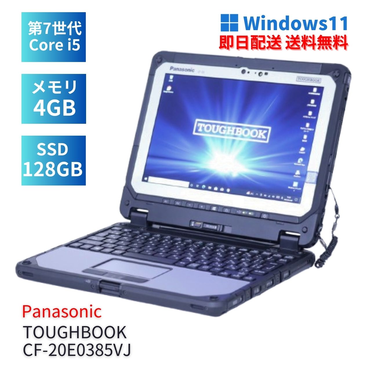 【メーカー】Panasonic デスクトップPC-単体 【型番/品名】TOUGHBOOK CF-20E0385VJ 1 【CPU】Core i5-7Y57 1.20GHz / 2コア4スレッド / ターボ・ブースト2.0最大3.30GHz 【メモリ】4GB 【ストレージ】SSD 128GB 【ディスプレイ】10.1インチ WUXGA タッチパネル 解像度 1920x1200 ※カテゴリ--5.1~11.9インチ 【グラフィック】Intel(R)内蔵グラフィックス 【光学ドライブ】-- 【Webカメラ】搭載 【無線LAN】搭載 【その他装備】Bluetooth、顔認証 (※その他インターフェースは画像とメーカーページ等でご確認ください。) 【OS】Windows11Pro-64bit(Win10DtoD-UPDATE) 【Officeソフト】LibreOffice(標準搭載、MicrosoftOfficeとの互換性高い) 【ウイルス対策】Windows Defender、Windowsファイアウォール 【寸法/質量】23.3 x 27.2 x 1.6 cm/重量 950 g(仕様・構成により変動する場合あり) 【付属品】ACアダプタ、スタイラスペン(本体装着) 【メーカーページ】(スペック完全一致でない場合あり) https://content.connect.panasonic.com/jp-ja/fai/file/40495 【取扱説明書】(機種・型番完全一致でない場合あり)。 https://dl-pc-support.connect.panasonic.com/public/s_manual/cf-20/cf20mk2-oi-readme-dhqx1428xa_j1_ja_secured.pdf
