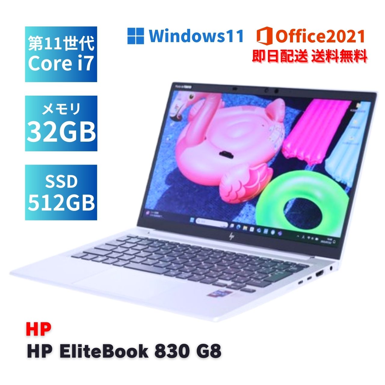 【メーカー】 日本HP ノートパソコン 【型番/品名】 HP EliteBook 830 G8 i7 5A1N8AV 【CPU】 Core i7-1165G7 2.80GHz / 4コア8スレッド / ターボ・ブースト2.0最大4.70GHz 【メモリ】 32GB 【ストレージ】 SSD 512GB NVMe PCIe 【ディスプレイ】 13.3インチ FHD 解像度 1920x1080 ※カテゴリ--13.0~13.9インチ 【グラフィック】 Intel(R)内蔵グラフィックス 【光学ドライブ】 - 【Webカメラ】 搭載 【キーボード】 バックライトキーボード 【無線LAN】 Wi-Fi 6(IEEE802.11ax)対応 【その他装備】 Bluetooth、USBTYPE-C(Thunderbolt3)x1、顔認証 (※その他インターフェースは画像とメーカーページ等でご確認ください。) 【OS】 Windows11Pro-64bit(DtoDリカバリ有) 【Officeソフト】 LibreOffice(標準搭載、MicrosoftOfficeとの互換性高い)/Microsoft Office Professional Plus 2021●選択可 【ウイルス対策】 Windows Defender、Windowsファイアウォール 【寸法/質量】 (幅x奥行きx高さ)307.8 x 204.6 x 17.9(最薄部、突起部含まず)mm/重量:約1.26kg (仕様・構成により変動する場合あり) 【付属品】 ACアダプタ 【メーカーページ】(スペック完全一致でない場合あり) https://jp.ext.hp.com/prod/notebooks/business/elitebook_830_g8/bto/ 【取扱説明書】(機種・型番完全一致でない場合あり)。 https://support.hp.com/jp-ja/product/setup-user-guides/hp-elitebook-830-g8-notebook-pc/model/2101143503